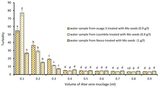 Turbidity variation depending on the volume of Aloe mucilage added in Moringa seeds-based treatment. The letters “a, b, c, d” indicate the different variations. Sticks with the same letters have statistically not different values. However, sticks with different letters have statistically different values.