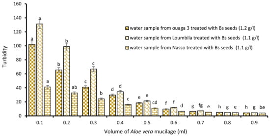 Turbidity variation depending on the volume of Aloe mucilage added in Boscia seeds-based treatment. The letters “a, b, c, d, e, f, g, h” indicate the different variations. Sticks with the same letters have statistically not different values. However, sticks with different letters have statistically different values.