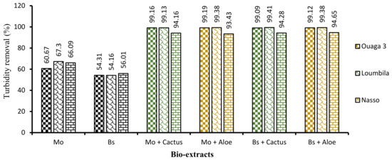 The decantation of colloids in dirty water obeys Stokes’ law. This law shows that the falling speed of a particle is proportional to the difference in density between the particle and the liquid, and to the square of the particle diameter. Therefore, any phenomenon that increases the diameter of the particles, such as the addition of a flocculating agent, promotes sedimentation. That is why the optimization of the capacity of the biocoagulants Mo and Bs consisted of first applying the seeds of Moringa oleifera and Boscia senegalensis as a coagulant, then the mucilages of Aloe vera and Opuntia ficus-indica as the flocculant a second time. Four combinations of the type of biocoagulant/bioflocculant were obtained: Moringa/cactus, Moringa/Aloe, Boscia/cactus and Boscia/Aloe. These combinations were applied on the three collected water samples.