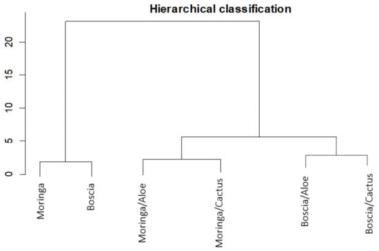 Analyzing Figure 8, which shows the proportion of turbidity removal for each extract and for each combination, we can deduce in addition to the hierarchical classification (Figure 9) that Moringa seeds were more effective than Boscia seeds. As for the flocculants, Aloe mucilage seemed to be more effective than cactus mucilage because the optimal volumes of Aloe mucilage remained lower than those of cactus mucilage for the treatment of the same water samples and under the same conditions. We can therefore deduce that the Moringa/Aloe complex was the best combination, followed successively by Moringa/cactus, Boscia/Aloe and Boscia/cactus complexes.