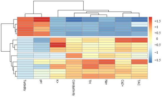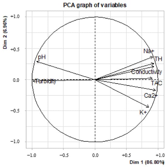 The physicochemical parameters measured took into account the main parameters of sanitary impact and acceptability of drinking water. These included turbidity, pH, conductivity, temperature, alkalimetric title (AT), complete alkalimetric title (CAT), hydrometric title (HT), calcium and magnesium hardness (TCa2+, TMg2+) as well as the content of certain minerals such as sodium and potassium. Turbidity was measured using the nephelometric method by a WTW Turb 550 IR turbidimeter in accordance with the French standard NF ISO 7027 (2000). The results were expressed in nephelometric turbidity units (NTU).