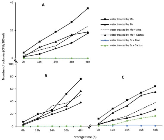 The microbiological analysis of the water treated with the bioextracts also showed very interesting results, especially in the reduction of Escherichia coli, total coliforms and enterococci. Thus, in the first step, the application of Moringa and Boscia bioextracts allowed an average reduction of 90% of bacteria for each treated water sample. This significant reduction supported the hypothesis that Moringa oleifera and Boscia senegalensis seeds’ powder has antimicrobial properties against Gram-negative and Gram-positive bacteria [,]. The combination of these two coagulants with cactus and Aloe mucilages allowed an average reduction of 98 to 100% of the different microbial indicators and was explained by the fact that the decanting time was short now.