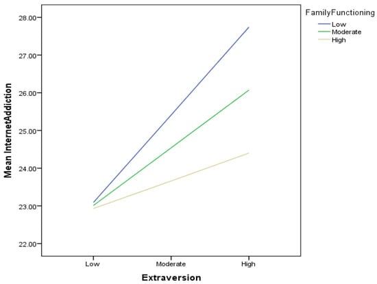 The main objective of the current study was to examine the impact of personality traits and family functioning on internet addiction among adolescents. Additionally, this study looked at how family functioning moderated such relationships. According to the current study’s findings, extraversion was significantly and positively associated with internet addiction among adolescent students; thus, Hypothesis 1a was supported. This means that those with traits of extraversion reported high addiction to the internet. This is consistent with the findings of some studies [,], which showed a positive association between extraversion and internet addiction. This could be from the inference that extroverts draw energy from interacting with others, which increases their levels of more extensive social networks [], thereby facilitating online interaction [], which is a prelude to internet addiction. Thus, adolescents with the trait of extraversion have arrays of social interaction, which increases the proposition of online interaction. Hence, extensive social networks akin to extroverts increases internet addiction via online interaction.