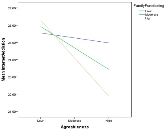 In addition, the interaction of agreeableness and family functioning was also significant (B = −0.07; 95% CI [−0.12, −0.01], p < 0.05); thus, Hypothesis 3b was supported, indicating that positive family functioning moderated the relationship between agreeableness and internet addiction. The slope of the interaction (Figure 2) indicated that, for those with moderate family functioning (B = −0.19, t = −2.86, p < 0.01) and those with high family functioning (B = −3.64, t = −3.64, p < 0.001), agreeableness was associated with less internet addiction, but for those with low family functioning, agreeableness was not significantly associated with internet addiction (B = −0.04, t = −0.49, p = 0.626). The variables in the equation accounted for 4% R2 = 0.04, F (6, 1774) = 8.97, p < 0.01.