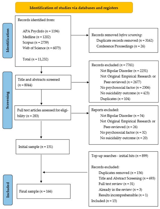 A sample of 166 published studies was initially identified for inclusion (n = 151 from the initial searches plus n = 15 studies from the top-up searches in November 2023). Four articles reported analyses from two larger studies and featured similar analyses, assessments, and sample characteristics, and so these four articles were treated as two studies in the synthesis [14,35,36,37] (making a sample of 164 studies). Only one study in the final sample was qualitative in design [38] and featured one-to-one interviews focusing on participants’ experiences of Bipolar Disorder and the social factors influencing their past experiences of suicidality. The remaining 163 studies were all quantitative by design; most of them were cross-sectional and were primarily focused on participant- and/or clinician-reported measures of symptoms and psychosocial factors (n = 143), with 18 prospective studies (ranging from shorter-term follow-ups of approximately 3–4 months, e.g., [37,39], to longer-term follow-ups of 6–8 years on average [40,41]), and a further two studies which analyzed hospital records and patient chart data [42,43].