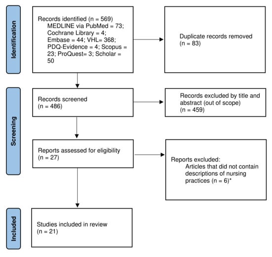 The database search and manual search identified 569 studies. After removing duplicates, the titles and abstracts of 486 publications were read, with 27 articles being selected for a full reading. Of this total, six articles did not clearly describe which nursing practice(s) brought the best results for the care of victims in earthquake situations and were therefore excluded. To compose the final sample, 21 studies [13,14,15,16,17,18,19,20,21,22,23,24,25,26,27,28,29,30,31,32,33] were selected (Figure 1).