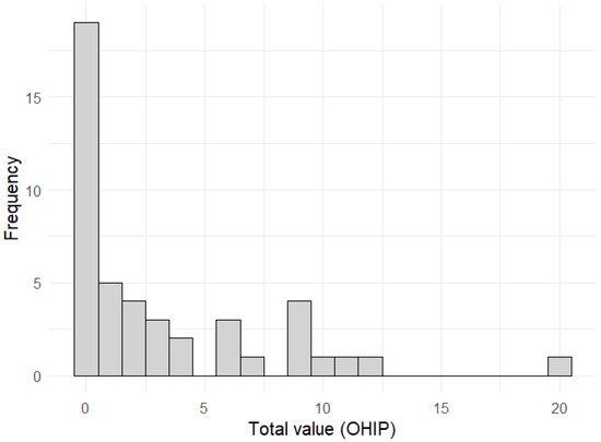 To better classify the striking result in OHIP, the distribution of OHIP scores is shown and described graphically below. Figure 1 shows the distribution as a histogram. The right-skewed distribution and an outlier at the sum value of 20 are evident.