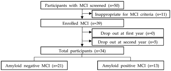 We initially recruited 50 patients for the study, but 11 patients were excluded as they did not meet the diagnostic criteria for MCI (Figure 1). The enrolled 39 patients were followed up for 1 year, but 5 patients were lost to follow-up and dropped out within 2 years. Consequently, the final analysis included 34 participants. The visual analysis of 18F-Florapronol PET revealed increased amyloid depositions in 13 of 34 (38.2%) participants. Meanwhile, a quantitative analysis showed positive amyloid deposits in 12 of 34 (35.3%) participants.