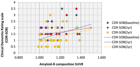 Figure 2. Correlation plot between CDR-SOB and Amyloid-ß composite SUVRs. CDR-SOB, Clinical. Dementia Rating–Sum of Boxes; SUVRs, standardized uptake value ratios.