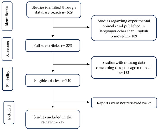 Overall, 529 records were identified about the use of antidepressants during lactation. After the exclusion of papers published in languages other than English and experimental studies in animals, 420 studies were considered eligible. Searching only the full-text articles, 373 records were selected. A total of 133 papers were excluded concerning single case-reports and case-series with missing data about drug dosage. From the remaining records, 25 reports were not retrieved. The research strategy allowed the final identification of 215 references (Figure 1), and five recommendations were generated.