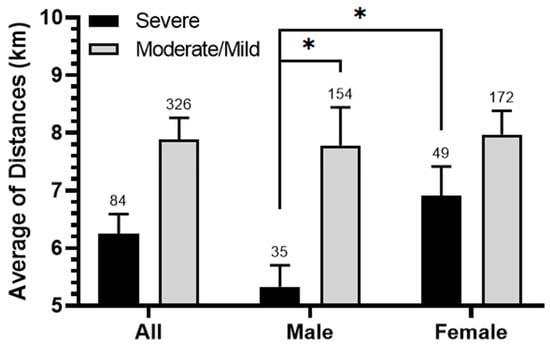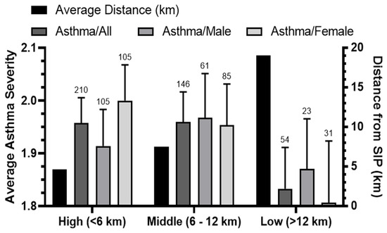 The relationship between the severity of asthma and the average distance of patients’ residences from SIP. Average distance (km) was calculated for male, female, and entire populations (all) and categorized by different levels of asthma severity (severe, moderate/mild). The significance of the differences was determined by a Mann–Whitney U-test at p < 0.05 *.