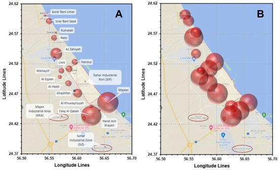 The rapid industrialization and urbanization in Oman have led to a significant escalation in air pollution levels, primarily driven by industries such as oil refineries and manufacturing facilities [17]. The SIP, one of the largest in the Middle East, has witnessed rapid industrial development, resulting in the emission of several harmful substances [36,37]. Recent reports show heightened levels of particulate matter (PM10), nitrogen dioxide (NO2), nitrogen oxides (NOs), sulfur dioxide (SO2), and volatile organic compounds in the surrounding area [36,37]. Research by Al-Wahaibi and Zeka [38] also found increased pollutant concentrations near SIP, exceeding national standards. These contaminants contribute to poor air quality in the surrounding area, posing potential risks to both the environment and human health [36,39].