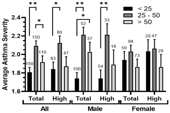 The relationship between the age ranges and the average asthma severity. Average asthma severity was calculated in the studied population (all, male, and female) in two location conditions (total and high-exposure zone <6 km from SIP) after clustering according to ages (<25, 25–50 and >50 years). The significance of the differences was determined by a Mann–Whitney U-test at p < 0.05 * and p < 0.005 **.
