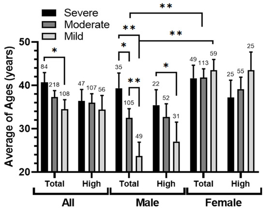 The relationship between asthma types and the average patient ages. Average patient ages in the studied population (all, male, and female) in two locations (total and high-exposure zone < 6 km from SIP) clustered according to asthma level (severe, moderate, and mild). The significance of the differences was determined by a Mann–Whitney U-test at p < 0.05 * and p < 0.005 **.