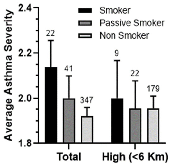 A compelling pattern emerges when examining the average asthma severity among different groups of patients, namely smokers, passive smokers, and non-smokers. A discernible and consistent gradient can be observed in the association between the average asthma severity and smoking (Figure 7). However, it is noteworthy that this link becomes somewhat less distinct within the community of patients residing in close proximity to SIP. This finding implies that pollution stemming from the port may yield a more significant impact on the average asthma severity than smoking itself.