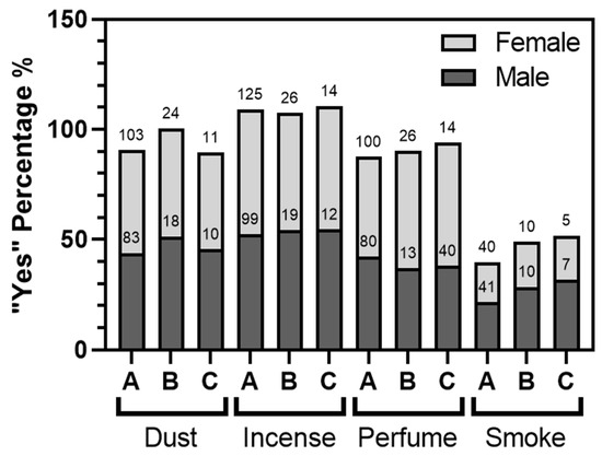 Subsequently, we conducted a thorough investigation of the disparities in “Yes” responses in the contaminant survey between males and females, as well as the existence of a relationship with severe asthma and proximity to the port (Figure 8). The findings clearly indicated a statistically significant divergence of opinions regarding the negative impact of these pollutants on asthma development (p < 0.001), except for dust and perfume, where no significant differences were observed. Specifically, when comparing the percentage of male and female “Yes” voters, smoke emerged as the least significant pollution factor among those with high statistical significance. It is noteworthy that there was an unanimous agreement, statistically significant, that incense was the most bothersome factor for male and female asthma patients. This perception remained consistent regardless of the severity of asthma or proximity to SIP. Additionally, an interesting observation was the increase, particularly among males, in affirming the presence of smoke contamination among the group of severe asthma patients and those living near SIP. Although not reaching full statistical significance, there was a notable difference of opinion on the effect of smoke between males and females in these three conditions, approaching significance (p = 0.06 by the Chi-square test).