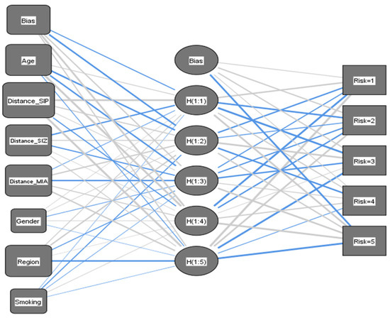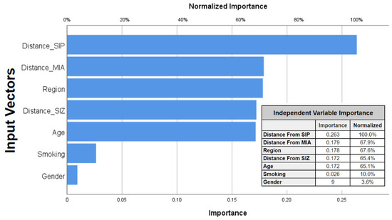 Additionally, an assessment of the normalized importance of each predictor variable revealed the prominence of proximity to SIP as the most influential factor. Subsequently, several covariates such as proximity to the MIA and SIZ areas, age, and regions followed in terms of importance (Figure 10). Conversely, smoking and gender had minimal impact on the constructed neural network model. Normalized importance serves as a quantifiable measure of the extent to which the predicted value of the dependent variable, AR, would be affected by the exclusion of a particular predictive indicator.