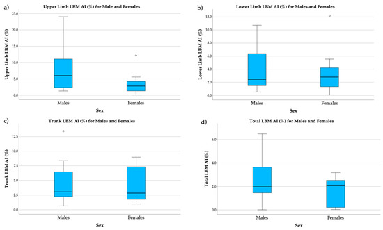 LBM AI in males and females: (a) upper limb LBM AI (%) in males and females; (b) lower limb LBM AI (%) in males and females; (c) trunk LBM AI (%) in males and females; (d) total LBM AI (%) in males and females. LBM: lean body mass; AI: asymmetry index; ° represents potential outliers.