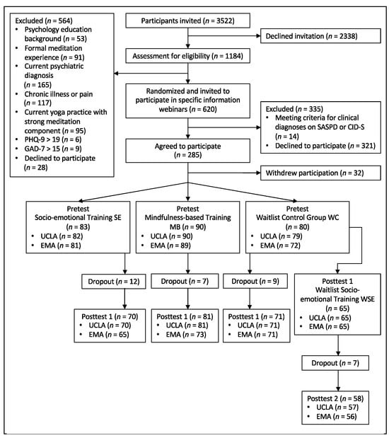 The CovSocial project’s phase 2 recruited participants from a community sample in Berlin, initially selected from phase 1 participants (Figure 1). Various recruitment methods, including registration office sampling and social media advertising, led to 7214 registrations, with 3522 completing the phase 1 questionnaires. These 3522 individuals were invited to a pre-screening for phase 2, in which eligibility based on specific criteria was assessed. Phase 1 inclusion criteria comprised age (18–65), Berlin residency, and German proficiency. Participants were excluded from phase 2 if they lacked internet access or necessary technical equipment, had a background in psychology, engaged in regular spiritual practices, took specific medications, participated in stress reduction programs, suffered from chronic illness or pain, had a psychiatric history, or exceeded cutoff scores on questionnaires assessing alexithymia [38], depression [39], and anxiety [40], including an item for suicidality. Eligible participants were randomly assigned to three groups, initially oversampling for ideal group sizes. Detailed information about the recruitment process, study design, and interventions can be found in Supplementary Material S1 and the study protocol [37].