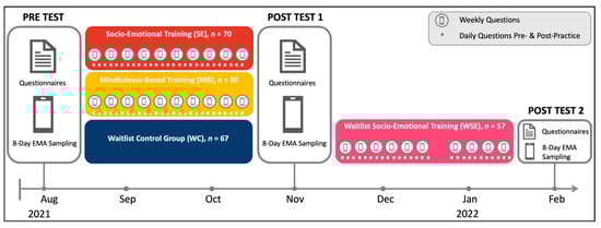 - Godara, M.; Silveira, S.; Matthäus, H.; Heim, C.; Voelkle, M.; Hecht, M.; Binder, E.B.; Singer, T. Investigating differential effects of socio-emotional and mindfulness-based online interventions on mental health, resilience and social capacities during the COVID-19 pandemic: The study protocol. PLoS ONE 2021, 16, e0256323. [Google Scholar] [CrossRef]