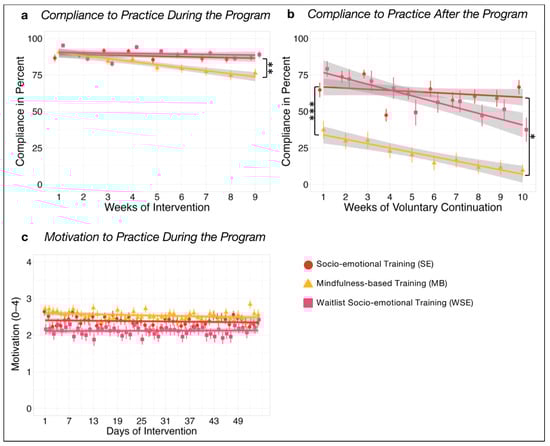 Voluntary continuation of practice (Figure 3) for a further 10 weeks after the posttest showed no significant change over time in SE (βSE = −0.02, p = 0.889). In MB, the decrease was significant (βMB = −0.08, p < 0.001), with a significant difference between groups (βdiff = −0.06, p = 0.027). A significant difference in baseline levels at week 1 reflected a significantly higher continuation attendance in SE compared to MB (βdiff = −0.82, p < 0.001). In WSE, continuation compliance significantly decreased over time (βWSE = −0.11, p < 0.001).