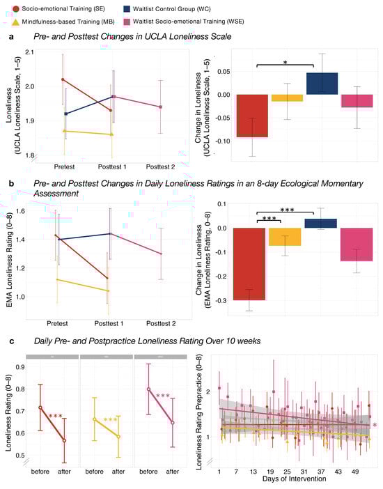 Group differences at pretest, posttest 1 and posttest 2, and of pre- to posttest changes using unstandardized estimates of the linear mixed model of (a) UCLA-20 and (b) ecological momentary assessment (EMA). Group differences in (c) mean daily pre- to post-practice changes in loneliness ratings and trajectories over 10 weeks of training in daily pre-practice loneliness ratings. Difference Scores are extracted from linear mixed models with sex and age as covariates. Data are presented as means and standard errors. Bonferroni corrected significance level of * α = 0.05 and *** α = 0.001.