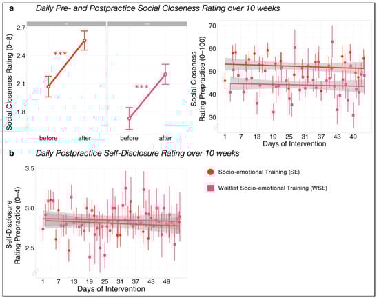 Group differences in (a) mean daily pre- to post-practice changes in social closeness ratings and trajectories over 10 weeks of training in daily pre-practice social closeness ratings. Group differences in trajectories over 10 weeks of training in daily post-practice self-disclosure ratings (b). Difference Scores are extracted from linear mixed models with sex and age as covariates. Data are presented as means and standard errors. Bonferroni corrected significance level of *** α = 0.001.