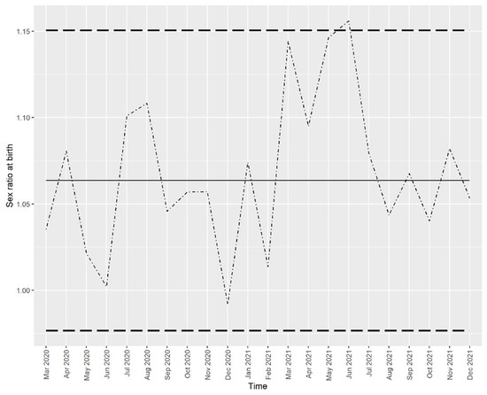 In the analyzed period (January 2010 to December 2021), a total number of 462,863 live births were recorded, of which 238,601 were males and 224,262 were females, yielding a total SRB of 1.064. The complete monthly series of SRB is presented in Figure 1.