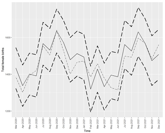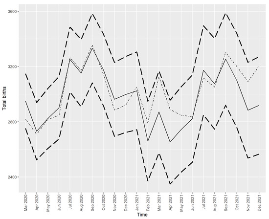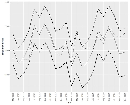 Figure 4 and Figure 5 show that all the actual values (dotted/dashed lines) were within the 95% prediction interval and close to the predicted values (solid lines), except for the number of male births in March 2021, which was higher than predicted. However, this higher-than-expected number of male births did not drive the SRB value out of the predicted interval, as seen in Figure 2.