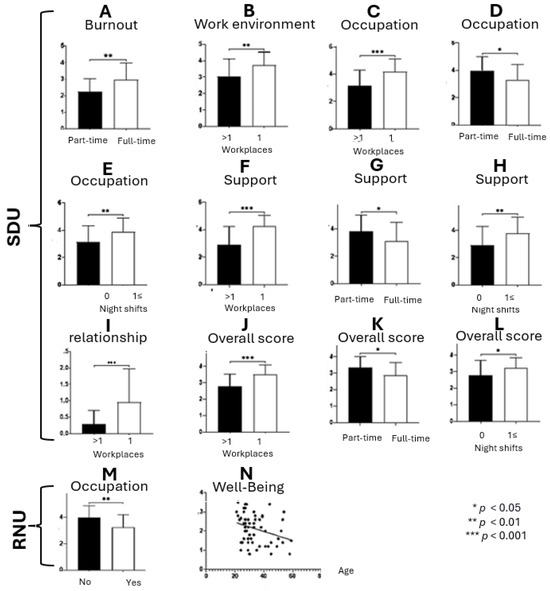 When analyzing the survey data regarding SDUs, all survey indexes—except for the well-being index—were significantly correlated (positively or negatively) with their unit caregivers’ background variables. In addition, working in multiple jobs was found to be significantly associated with most indexes.