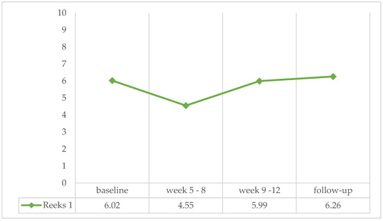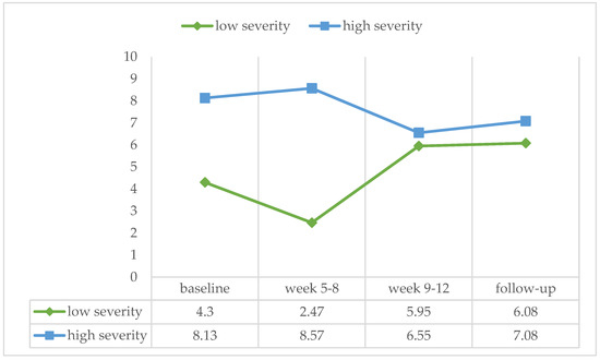 According to the MATE algorithm, 12 patients were categorized with a high severity of addiction. A Mann–Whitney test for independent samples showed no significant difference between groups in any of the treatment phases (baseline: U = 108.50, ns, r = −0.145; week 5–8: U = 92.00, ns, r = −0.295; week 9–12: U = 116.50, ns, r = −0.071; follow-up: U = 119.00, ns, r = −0.009) (see Figure 3).