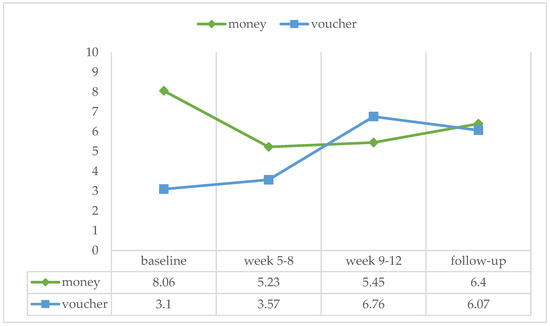 We also could not find an effect of the reward type on the mean percentage of positive urine samples in any of the treatment phases (baseline: U = 117.5, ns, r = −0.168; week 5–8: U = 133.00, ns, r = −0.056; week 9–12: U = 134.50, ns, r = −0.038; follow-up: U = 125.5, ns, r = −0.063) (see Figure 2).