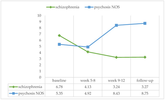 Sixteen patients were diagnosed with schizophrenia/schizoaffective disorder, and eighteen patients with psychotic disorder NOS. A Mann–Whitney test for independent samples showed no significant effect of diagnosis in any of the treatment phases (baseline: U = 136.00, ns, r = −0.059; week 5–8: U = 140.00, ns, r = −0.032; week 9–12: U = 100.00, ns, r = −0.299; follow-up: U = 124.5, ns, r = −0.088) (see Figure 4).