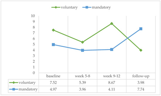 In this study, patients who were in voluntary treatment as well as patients who were admitted as mandatory were included. This had no effects on the intervention efficacy (baseline: U = 125.50, ns, r = −0.108; week 5–8: U = 128.00, ns, r = −0.097; week 9–12: U = 96.00, ns, r = −0.202; follow-up: U = 121.50, ns, r = −0.073) (see Figure 5).
