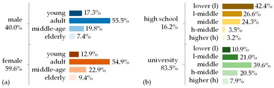 Sociodemographic profile of respondents: (a) age grouped by gender and (b) income grouped by education.