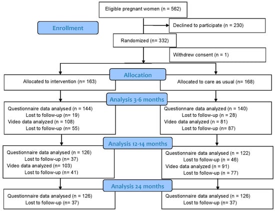 Of the 562 invited pregnant women, 332 (57%) consented to participate in the trial and filled out the baseline questionnaire. After completion, one participant retracted her consent and wished to have all data deleted, leaving the baseline sample that was randomized to 331 pregnant women (163 FACAM and 168 CAU).