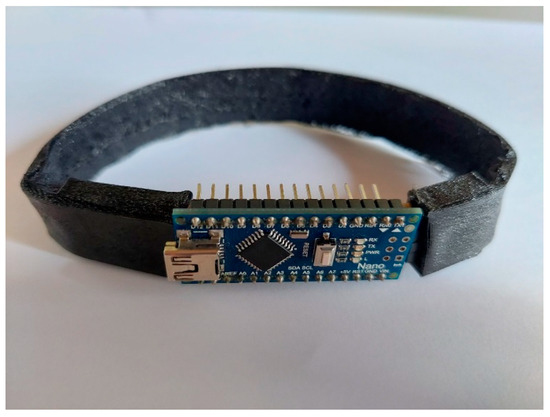 The hardware device consists of a specifically designed printed circuit board (PCB) and suitable storage that houses the processor and memory of the device with a strip for easy mounting. A key element in the PCB design was the PPG sensor. In particular, a ready-made solution with a unique integrated electro component that contains an LED and a corresponding photo receiver in one unique case was used (Available online: https://valencell.com/ppgsensors/, accessed on 1 May 2024). The electronic board is powered from a small 5 V watch battery, where the selection of the battery was made so that the device can work for a whole day without interruption. For the needs of the longest possible autonomy of the device, the design of the printed circuit board, consumption optimization methods were used. The board can communicate with the outside world via the USB bus, through which it is also possible to charge the battery. There is a special part of the electronic system designed for monitoring the state of the battery and for charging via USB port. The device also has a diode to indicate battery status to the outside world. The printed circuit board also contains a simple mechanical button for pain indication, that the patient presses when they feel severe pain in their legs. It is connected to the rest of the circuit and has a clear indication signal. The device is controlled by a microcontroller. This controller has the role of counting the patient’s steps from the accelerometer data. The board also contains additional flash memory. The flash memory is used to record signals from the PPG sensor, the number of steps, and recorded pressures on the pain indication button.