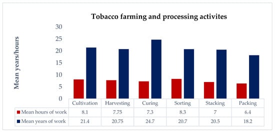 Prevalence of GTS by gender has varied in the literature, some finding it higher among men and others higher among women [4,5]. However, the prevalence of GTS was found to be higher among women tobacco farmers compared to men in India and Korea [9,10]. It is also possible that the burden among women is underrepresented at times due to the historical lack of female workers in tobacco [11]. During tobacco production, women are affected differently from men biologically due to the critical phases of vulnerabilities during pregnancy [12]. In Brazil, among women tobacco farm workers with a family history of asthma, wheezing was associated with tying bundles of tobacco, strenuous work, contact with chemical disinfectants, and GTS [13]. Women additionally have a higher burden of stressors from of tobacco work [14]. Among women tobacco farmers in Ambulu village in Indonesia, a significant relationship was observed between work stress and menstrual disorders [15]. Almost 5% of infants whose mothers exposed to pesticides in tobacco farming failed hearing screening. [16]. Tobacco farmers exposed to pesticides also exhibited signs of central auditory dysfunction characterized by decrements in temporal processing and binaural integration processes [17].