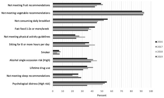 There is a limited number of studies that have considered how health-risk behaviors and psychological distress are changing among young adults (aged 17–24) commencing university. To our knowledge, no studies have tracked changes in a broad range of health-risk behaviors and psychological distress over time amongst a sample of young adult commencing university students, particularly prior to and during the COVID-19 pandemic. Therefore, this study aims to explore trends in health-risk behaviors (poor diet, physical inactivity, sedentary behaviors, alcohol intake, smoking, drug use, and poor sleep) and psychological distress among commencing Australian university students, aged 17 to 24 years, over four survey years—from 2016 to 2020.