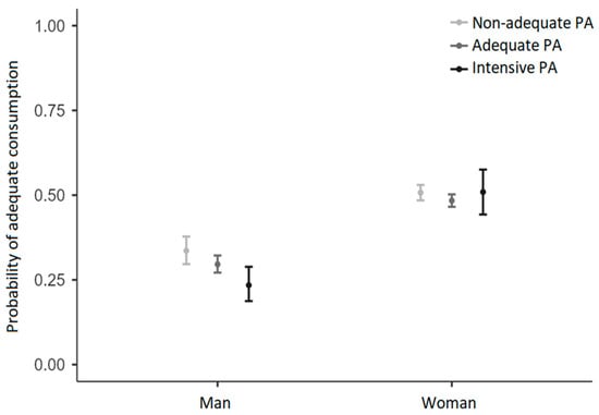 The binomial logistic regression results indicated that the full model was statistically significant, χ2 (5, N = 6947) = 242, p < 0.001, suggesting that it could distinguish between respondents who consumed an adequate amount of beef and those who did not. The model explained between 3.4% (Cox and Snell’s R2) and 4.6% (Nagelkerke’s R2) of the variance in beef consumption adequacy. As shown in Table 5, both gender (p < 0.001) and intensive physical activity (p < 0.005 for the contrast with insufficient PA; p < 0.05 for the contrast with adequate PA) were associated with beef consumption. The odds ratio indicated that women were two times more likely to report adequate consumption than men (OR = 2.035). Regarding physical activity, the odd ratios indicated that respondents who practiced intensive PA were one and a half times more likely to report non-adequacy than respondents who practiced insufficient PA (OR = 0.605) and adequate PA (OR = 0.727). The interaction between gender and physical activity suggested that non-adequacy was particularly evident in men who practiced intensive PA (see Table 5 and Figure 1).