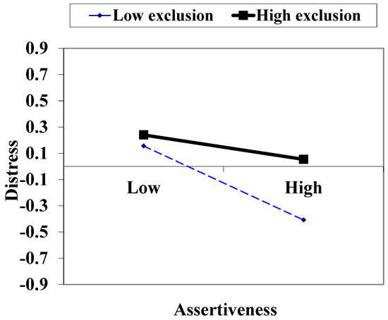 - Assertiveness is less negatively predictive of distress when social exclusion experienced is higher. That is, the coupling of assertiveness and social exclusion together is positively predictive of distress.