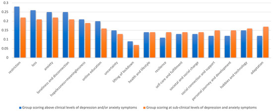 Proportions of data coded under each theme for participants with and without high depression and/or anxiety symptoms measured during the COVID-19 pandemic.