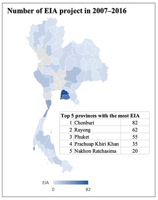 The number of EIAs implemented between 2007 and 2016 used by the authors; data were taken from [,,,]. Deep blue shows the location of Chonburi, followed by Rayong and Phuket.
