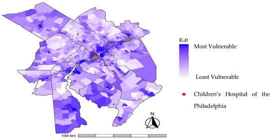 Environmental Justice Index (EJI) across metropolitan Philadelphia. Depicts EJI by census tract across the study area as calculated by the Centers for Disease Control and Prevention (CDC). Data Source: Centers for Disease Control and Prevention (CDC ATSDR and CDC NCEH, 2022). Map generated using ggplot2 package [] with R software (v4.3.2).