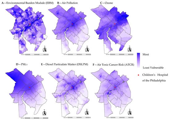 Environmental Justice Environmental Burden indices by census tract for metropolitan Philadelphia: (A) Depicts aggregate environmental burden by census tract. (B) Depicts aggregate air pollution index of the four pollutant indicators by census tract. (C) Depicts ozone vulnerability by census tract. (D) Depicts PM2.5 vulnerability by census tract. (E) Depicts DSLPM vulnerability by census tract. (F) Depicts ATCR vulnerability by census tract. Data Source: Centers for Disease Control and Prevention []. Maps generated using ggplot2 package [] with R software (v4.3.2).