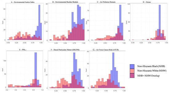 Distribution of index values of primary independent variables of interest among metropolitan Philadelphia patient cohort disaggregated by race: Non-Hispanic Black, Non-Hispanic White, and overlap between the Non-Hispanic Black and Non-Hispanic groups. Histograms depict the number of patients in the cohort disaggregated by race per 0.05 increment for each primary independent variable of interest: (A) is a histogram of EJI distribution. (B) is a histogram of EBM distribution. (C) is a histogram of air pollution distribution. (D) is a histogram of ozone distribution. (E) is a histogram of PM2.5 distribution. (F) is a histogram of DSLPM distribution. (G) is a histogram of ATCR distribution. Plots generated using ggplot2 package [] with R software (v4.3.2).