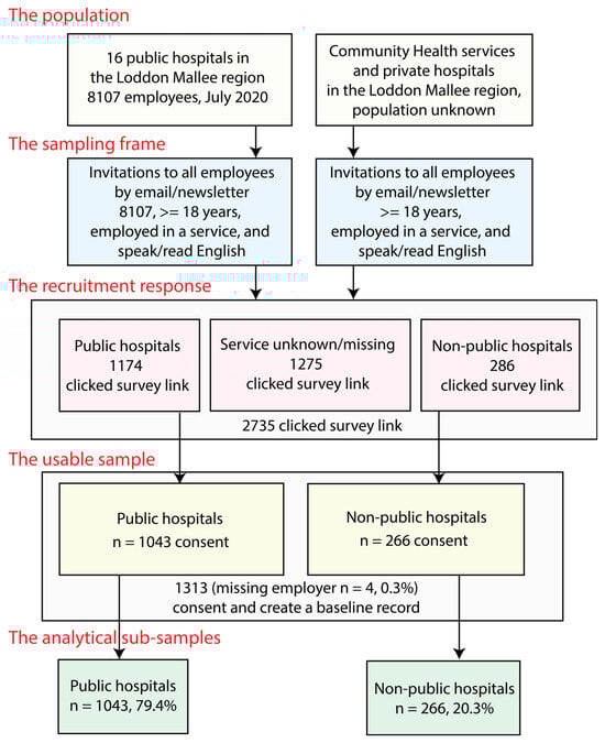 Email invitations were sent to all employees, (n = 8107) in public hospitals in the Loddon Mallee region. An unknown number of email invitations were also extended to non-public hospitals, community health organisations, and primary healthcare providers in the region through the staff email system and staff newsletters. A total of 2735 potential participants clicked on the baseline questionnaire link: 1174 from public hospitals (14.5% of this population), 286 from non-public organisations, and 1275 from other organisations. The number who completed the consent was 1043 from public hospitals (12.9% of this population); 266 from non-public hospitals, community health organisations, or primary healthcare providers; and 4 who were missing employer information. Of the 1313 consenting participants, 97.1% provided usable complete data.