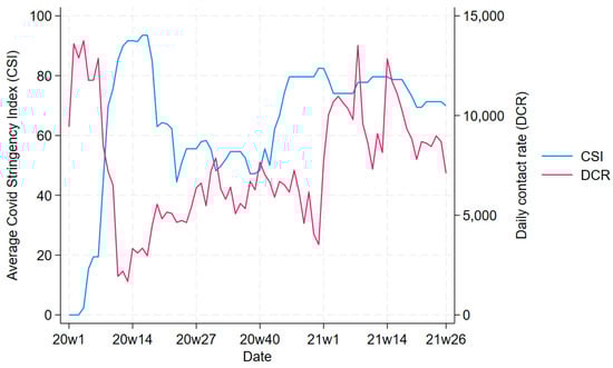 Trends in COVID-19 Stringency Index (CSI) and daily contact rate (DCR) in years 2020 and 2021.