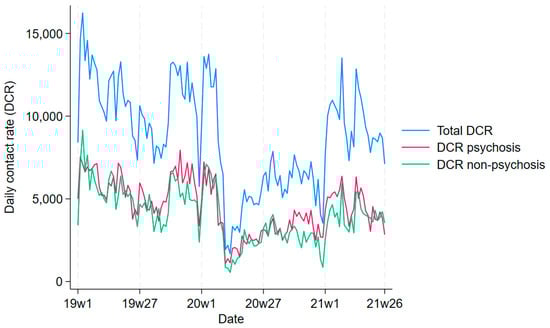 Trends in the global contact rate and the contact rate of patients with and without psychosis in the study period.
