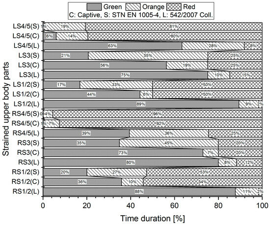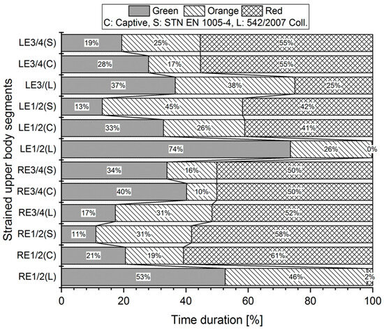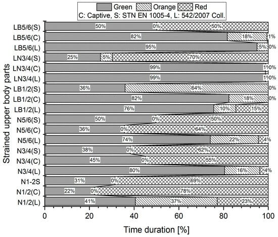 The basic principle of the ergonomic analysis in this article is to monitor the time that individual body segments (N—neck; RS—right shoulder; LS—left shoulder; RE—right elbow; LE—left elbow; UB—upper back; LB—lower back) spent in a specific working posture expressed in percentages. As mentioned above, we applied three different methods (standards: Captiv, STN EN, and SK Legislation).